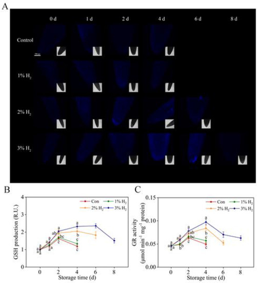 To determine whether the above molecular hydrogen responses resulted from influencing non-enzyme antioxidant substance and its metabolism, changes in reduced glutathione (GSH) content and glutathione reductase (GR: one of the synthetic enzymes for GSH metabolism) activity were also determined. For endogenous GSH to be tracked in situ, a commercial specific fluorescent probe monochlorobimane (MCB) was used (Figure 6A,B). As expected, in control and 1% H2-treated group, the MCB-dependent fluorescence was increased during 2 days of storage period, followed by a decrease until 4 days. Further results illustrated that above fluorescence was obviously impaired or delayed until 6 days or 8 days of storage period by 2% and 3% (in particular) H2 groups, reflecting the possibility that non-enzyme antioxidant substance in chives might also be influenced by H2. Meanwhile, we observed that activities of GR displayed similar tendencies (Figure 6C).