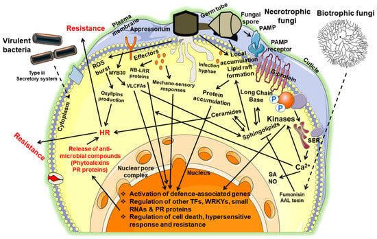 In plants, sphingolipids are the major signaling structural components of plasma membranes as well as other endo-membranes and play crucial roles in the host–pathogen interactions and other stress responses [47,100]. Chemically, sphingolipids are ceramide-containing fatty acid nonglycerol lipids connected to long-chain amino alcohol [101,102]. Because of their highly hydroxylated nature, sphingolipids improve membrane properties such as stability and permeability and even regulate protection against fungal pathogens and other environmental stresses [102]. This can be understood by the fact that sphingolipids are used to induce cell death in plants, which eventually limits the pathogen spread from damaged tissues. For example, a sphingosine analog is produced by Alternaria alternata f.sp. lycopersici, which serves as a virulence factor and causes programmed cell death both in plants and animals [103].