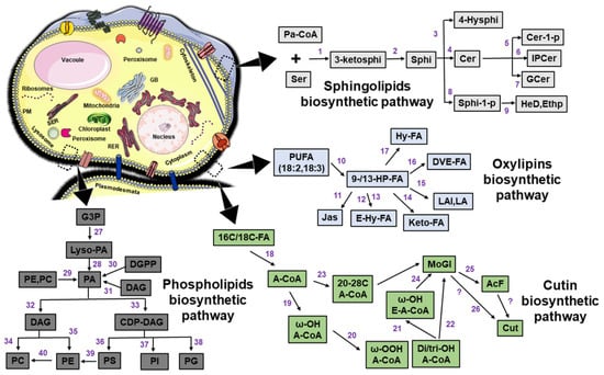 Several studies have revealed the role of lipids and lipid-related metabolites during plant–pathogen interactions over the past 25 years (Table 1). This role covers the lipoxygenase pathway-based production of defense-related oxylipins [14,15], the unsaturated fatty acid pathway for remodeling lipid composition in cellular and intracellular membranes [16], and the very-long-chain fatty acids (VLCFAs) pathway. In both eukaryotic and prokaryotic organisms (plants and phytopathogens), cellular membranes are rich in lipids—a primarily known class of hydrophobic molecules. As major constituents of both the plasma membrane and intracellular membranes, lipids play significant roles, such as being structural components of biological membranes, membrane fluidity, flexibility, and being involved in the regulation of membrane trafficking, cellular integrity, organelle identity, dynamic components of the enzyme system, the mediator in photosynthetic proteins, and signal regulation during cell metabolism and energy storage [17,18,19,20,21].