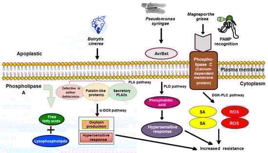 Phospholipase plays a versatile role in pathogen response and acts rapidly on the perception of stimuli [30]. The transcription of PLA, PLD, PLC, and diacylglycerol kinase (DGK)-encoding genes and their enzymatic activities have been reported to be enhanced upon elicitor treatment and pathogen infection in tomato (Solanum lycopersicum), rice (Oryza sativa), Arabidopsis (A. thaliana), and tobacco (Nicotiana tabacum) [106,107,108] (Table 2). Pathogen recognition initiates the cascade of phospholipase-dependent signaling pathways. PLAs hydrolyze membranous PL to produce LPL (Figure 2) and free fatty acids (FFA). PLAs are categorized into DAD (defective in the anther dehiscence), patatin-like proteins (pPLAs), and secretory phospholipase A2 (PLA2s). However, SAG101 (senescence-associated carboxylesterase 101), PAD4 (phytoalexin deficient 4), and EDS1 (enhanced disease susceptibility1) are the main components that shuttle during signaling via the activities of PLAs [30]. In a study, perforin-like proteins (PLP) and patatin-related phospholipase 2A (pPLA 2α) are activated after the invasion of P. syringae pv. tomato or B. cinerea [30]. In Arabidopsis, the modified regulation of PLP2 alters plant susceptibility to P. syringae pv. tomato or B. cinerea, whereas the expression of PLP2 promotes the growth of necrotizing pathogens but enhances the resistance towards devastating viral pathogen CMV (Figure 3). PLP2 expression promotes oxylipin accumulation in advanced stages of Botrytis invasion via α-DOX pathways and restricts the spreading of hypersensitive response (HR) [30]. Conclusively, PLP2 activities may be driven by pathogens to accelerate colonization within the host. In Arabidopsis, PLD and PLA activities are supposed to be interlinked during the plant defense response. When P. syringae expressing AvrBst (an effector molecule) infects the Pi-0 ecotype of Arabidopsis (Figure 3), PA production occurs through PLD pathways, which is mandatory for HR responses. A loss of function mutation in SOBERI1 (SUPPRESSOR OF AVRBST-ELICITED RESISTANCE 1) (exhibiting PLA activities) displays the resistance phenotype in the Pi-0 plant. In contrast, in the Col-0 a-susceptible Arabidopsis ecotype, SOBERI (PLA2) activity competes for the substrate with PLD, thus reducing the accumulation of PA to elicit an AvrBst response [109].