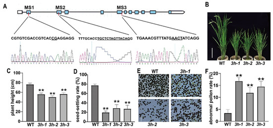 To determine whether the function of OseIF3h bears a close resemblance to that of in Arabidopsis, like regulation role in plant growth and development, we selected three mutation sites (MS) and created three independent mutants, namely 3h-1, 3h-2, and 3h-3 by CRISPR/Cas9 system (Figure 1A). Sequencing analysis showed that these three mutants were caused by the deletion of 2 bp, 14 bp, and 4 bp in exon 1, exon 2, and exon 5 of OseIF3h, respectively (Figure 1A). These non-triple base pair deletions lead to frameshift mutations and premature translation terminations, consequently generating truncated proteins with only 36, 79 and 156 amino acids. Subsequently, expression of OseIF3h was detected at protein level in these mutants using anti-OseIF3h monoclonal antibody. As shown in Figure S1, there was no signal of the full-length protein detected in the three mutants. These results verified that OseIF3h in these three independent mutant lines were indeed knock-out. Further phenotypic analysis indicated that the loss of OseIF3h seriously affected plant growth (Figure 1B). oseif3h mutants were about 55 cm in height, which was significantly shorter than that of wild type 77 cm (Figure 1C). Furthermore, severe phenotypic defects were observed on seed-setting rate. Under the same growth conditions, the seed-setting rate of the mutants was merely 20–30%, while that of the wild type was 78.4% (Figure 1D). To figure out whether the reduced seed-setting rate was the consequence of male fertility defect, the pollens were examined by I2-KI staining. The results showed that the number of abnormal pollen grains of the mutants was significantly more than that of the wild type (Figure 1E,F). In general, these results indicated that the mutation of OseIF3h led to aberrant development in rice, particularly in pollen fertility.