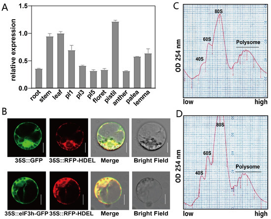 Expression pattern and subcellular localization of OseIF3h and its polysome profile. (A) RT-qPCR analysis of OseIF3h transcripts in various tissues. Pl1, Pl3, and Pl5 indicate the rice panicle length. Error bars indicate SDs from three biological replicates; (B) Subcellular localization of OseIF3h in rice protoplasts (cv Nipponbare background). 35S:OseIF3h-GFP was co-transformed with 35S:RFP-HDEL (an ER marker) into rice shoot protoplasts. Bars = 5 um. Protoplasts transfected with control vector (35S:GFP) have a bright GFP signal distributed in both cytoplasm and nucleus; (C,D) Representative polysome profiles derived from leaf extracts of WT and oseif3h-2 mutant, respectively. The position of 40S, 60S, 80S and polysome were marked in the figure, separately. Sedimentation is from low to high.