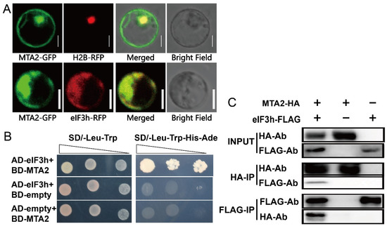 Analysis of interaction between OseIF3h and OsMTA2. (A) Subcellular localization of OsMTA2-GFP (upper panel) and co-localization of OseIF3h-RFP with OsMTA2-GFP (lower panel). H2B-RFP is an RFP-labeled nucleus marker. Bar = 5 μm. (B) Yeast two-hybrid assay, AD-eIF3h and BD-MTA2 could be grown on SD/-Trp-Leu-His-Ade medium, while the empty vector pGADT7 or pGBKT7 as negative control could not grow. (C) Co-IP assay, total protein extracts (input), HA-immunoprecipitation (HA-IP) and FLAG-immunoprecipitation (FLAG-IP) from rice protoplasts transformed with MTA2-HA and eIF3h-FLAG construct or MTA-HA alone construct or eIF3h-FLAG alone construct were analyzed by western blot with anti-HA and anti-FLAG antibodies (HA-Ab and FLAG-Ab).