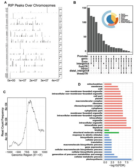 Characterization and distribution of OseIF3h associated peaks over chromosomes. (A) Peak location over the whole genome; (B) Distribution of peaks in transcript segments divided into 5′UTRs, exons, 3′UTRs, intron and intergenic region; (C) Profile of RIP peaks binding to 1kb upstream and 1kb downstream around TSS region; (D) Gene ontology (GO) enrichment analysis of gene in the proximity of RIP peaks. Statistical analysis was performed using agriGO online tools.