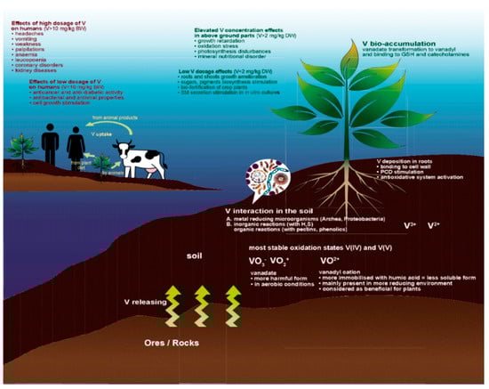 In excessive doses V becomes seriously harmful for all living organisms, regardless of whether they are sessile like plants or mobile like animals [111,128]. For humans, vanadium poisoning may be very dangerous and cause dermatitis, green coloration of the tongue, vomiting, headache, weakness, palpitations, anemia, leucopoenia, leukocyte granulation or coronary insufficiency, as well as chronic kidney disease [3,44]. Since considerable vanadium amounts can be supplied to human organism with food cultivated on contaminated land (Figure 1), it has become crucial to monitor the content of this element in the soil and in crops grown for consumption. Moreover, it is very important to elucidate in detail how different plant organisms function in the presence of vanadium, and in particular, the availability and storage of V must be thoroughly investigated at various levels of biological organization.