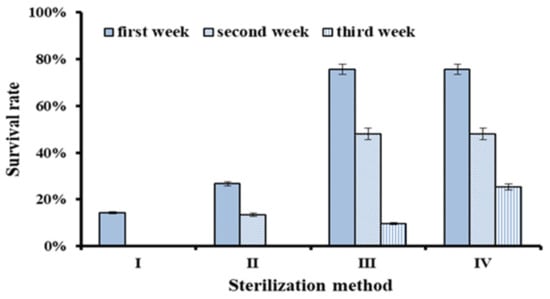 In order to improve the sterilization effect of H. serrata explants, different sterilization methods or combinations were used in this study (Table 1). The results showed that the survival rate of explants from different sterilization methods was significantly different (Figure 1). The survival rates in the first week were 14.29% for Method I, 26.67% for Method II, and 75.59% for Method III, respectively. Two weeks later, the survival rates were 0% (Method I), 13.33% (Method II), and 48.03% (Method III), respectively. Therefore, Method III was much better than Method II and I.