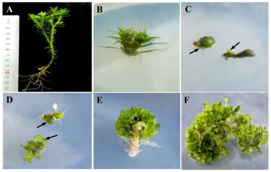 In vitro micropropagation process of H. serrata. (A) Wild plant of Fujian genotype. (B) Inoculated stem. (C) Regeneration from callus, arrows shows the regenerated thallus. (D,E) Thallus regeneration from spores on stems. (F) Thallus proliferation.