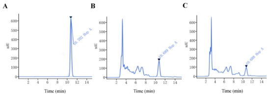 Chromatogram of the Huperzine A in different sample. (A) Chromatogram of the HupA standard. The retention time for HupA standard was 10.702 min. (B) Sample chromatogram of H. serrata extract (plant collected in Fujian Table 5). The retention time for the HupA was 10.689 min. (C) Sample chromatogram of the FJ’ propagated extract (plant collected In vitro). The retention time for the HupA was 10.688 min.