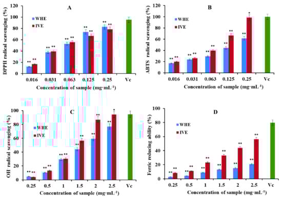 The OH− scavenging activity and the ability to reduce Fe3+ of WHE and IVE are shown in Figure 5C,D. The results showed that the hydroxyl radical scavenging activity and the ability to reduce Fe3+ of IVE was significantly greater than that of WHE at the same tested concentration. The highest scavenging activity of IVE was to 94.29 ± 1.02% for OH− scavenging capacity and 56.07 ± 0.61% for the ability to reduce Fe3+ value at the concentration of 2.5 mg·mL−1. However, it is 77.05 ± 0.72% and 20.77 ± 0.84% in WHE, respectively. IC50 values of IVE in OH− scavenging activity and the ability to reduce Fe3+ were 1.37 and 2.52 mg·mL−1, respectively. IC50 values of WHE in OH− scavenging activity and the ability to reduce Fe3+ were 1.67 and 9.73 mg·mL−1, respectively (Table 6).