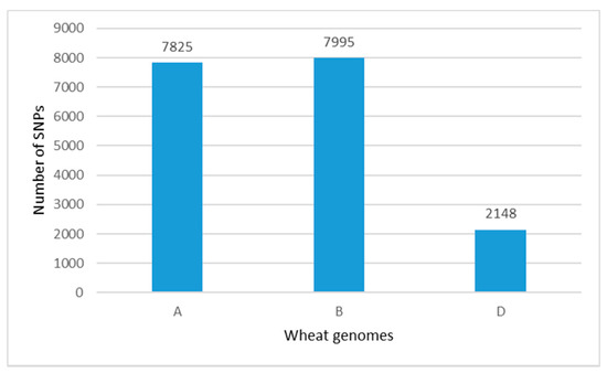 The 19,019 SNPs were well distributed across all 21 wheat chromosomes within the set of 179 accessions. A total of 17,968 SNPs had known positions on the A-, B- and D-genome chromosomes (Figure 2), and 1051 SNPs representing 6% of the total number of 19,019 markers were not assigned with any chromosome.