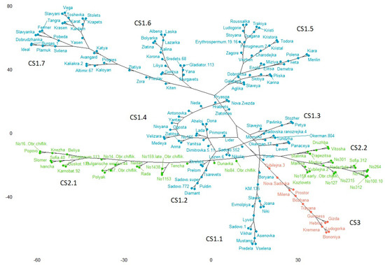 The second-largest cluster CS2 (41 entries, in green) corresponded to SP2, including exclusively the old cultivars and landraces, and only three modern releases. This cluster can be divided into two branches: CS2.1, consisting of 22 entries, of which 15 from the Northern region, five from the Southern and two from the Western part of the country. In this branch, the cluster analysis placed one modern cultivar (Rada). Branch CS2.2 comprised 19 accessions, of which two (Druzhba and Trapezitsa) were modern ones. The distribution according to the geographic region was: Northern—11, Southern—six and Western—two. The smallest cluster CS3 (13, in red) corresponded entirely to SP3. Ten entries in this cluster were contemporary ones and only two (Nova Sadovka and Yubilejna-3) belonged to the old germplasm.