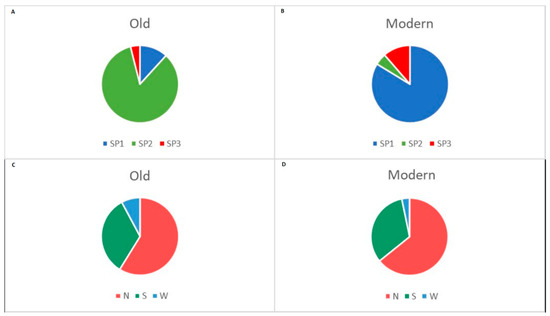 Distribution of old (A) and modern (B) accessions depending on their assignment to the STRUCTURE subpopulations (SPs). Distribution of old (C) and modern (D) accessions according to the geographic origin—breeding centre/collection site (N, Northern; S, Southern; W, Western part of Bulgaria).