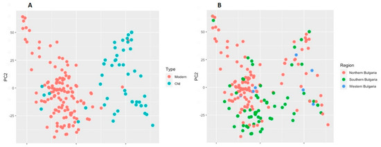 Principal component analysis (PCA) of 179 Bulgarian bread wheat accessions. (A) Differentiation between old and modern accessions; (B) Differentiation between accessions according to the region of breeding or collection site.