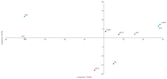 Principal Component Analysis performed on peel oil samples (components higher than 2%). Green: hys: C. hystrix, mic: C. micrantha, mapt: C. macroptera; Red: lat: C. latipes, ich: C. ichangensis; Blue: wil: C. wilsonii, jun: C. junos, maph: C. macrophylla.