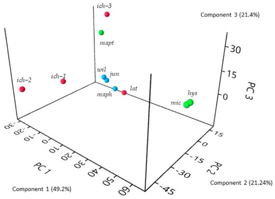 Three-dimensional Principal Component Analysis of leaf oil samples (components higher than 2%). Green: hys: C. hystrix, mic: C. micrantha, mapt: C. macroptera; Red: lat: C. latipes, ich: C. ichangensis; Blue: wil: C. wilsonii, jun: C. junos, maph: C. macrophylla.