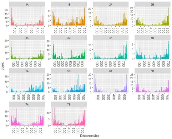 After filtering the data to remove markers with minor allele frequencies below 5% and more than 10% of missing data, 8025 DArTSeq markers were selected for association analyses. The distribution of these markers along the wheat chromosomes was inspected by plotting their distribution at each chromosome (Figure 2).