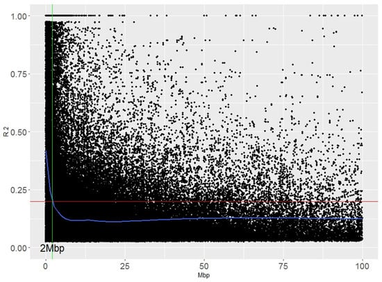 Linkage disequilibrium (LD) analyses were performed that considered the whole collection of durum wheat accessions. Overall, 95% of the unlinked markers showed an r2 value of <0.2. This value corresponded to a distance of 2.0 Mbp (Figure 3). The LD in landraces is usually lower than in modern accessions, as revealed in the global durum wheat panel [4], with distances of 4.2 Mbp and 42.3 Mbp corresponding to the r2 values of the unlinked markers [4].