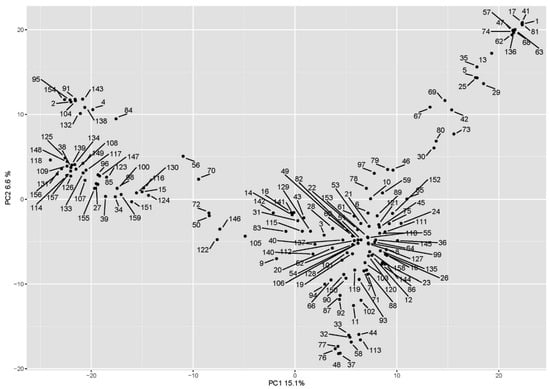 Phenotypic datasets were analyzed together with the marker data by genome-wide association analysis using an MLM (Q + K) model, considering the population structure matrix (the Q matrix obtained from the principal component analysis) and the kinship matrix. The biplot of the first two PC scores of the principal component analysis is shown in Figure 4. The Manhattan plots are shown in Figure 5. The marker-trait associations (MTAs) with LOD values greater than the FDR threshold of each trait were declared significant (Table 1).