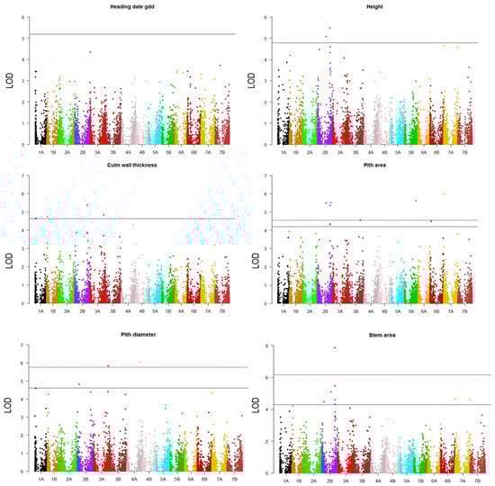 A total of 29 MTAs were above the FDR threshold established for each trait and were distributed as follows: there were 2 for height on chromosomes 4A and 5A; 4 for the culm wall thickness (1A, 1B, 2B and 3A); 8 for the stem area (six on 2B and two on 7A); 4 for the pith diameter (1A, 2B, 3A and 4B) and 10 for the pith area (six on 2B, 3B, 5B, 6B and 7A). No MTA above the threshold was identified for the heading date, but the marker with the highest LOD—3570185—was selected for further inspection.