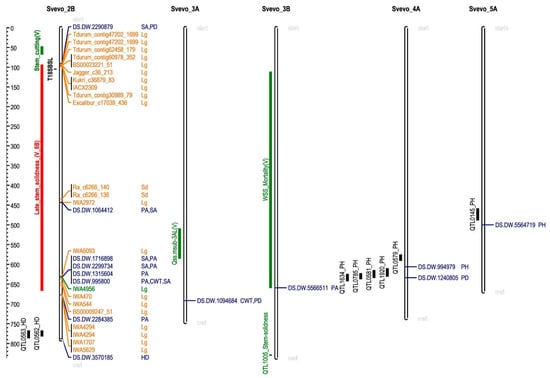 Regarding stem properties, no QTL for stem traits was located in the vicinity of the areas identified in this work with the ‘Svevo’ QTL track. Thus, the GWAS track available at the bread wheat ‘Chinese Spring’ genome browser [35] was explored in looking for markers associated with lodging or stem diameter in the chromosomes where our MTAs are located. After this, the positions of these markers in the ‘Svevo’ genome were identified and compared to our results (Figure 6).