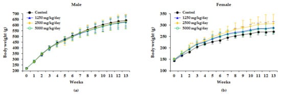 No significant differences in bodyweight between the control and treatment groups were observed in male rats during the study period. However, a significant increase in bodyweight was observed in female rats of the 2500 mg/kg/day group in weeks 2, 3, 5, 6, 7, 8, 10, 11, and 12 (Figure 1).