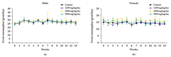 Food consumption of male (a) and female (b) rats treated with 0, 1250, 2500, and 5000 mg/kg/day in the 13 weeks repeated oral dose toxicity study of WG extract. Results are presented as the mean ± standard deviation (n = 10). Significantly different from the control group at * P < 0.05.