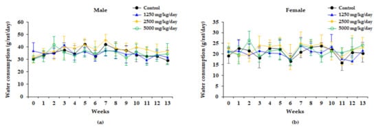 There were no significant changes in water consumption between the control and treatment groups in rats of either sex at any doses during the study period (Figure 3).