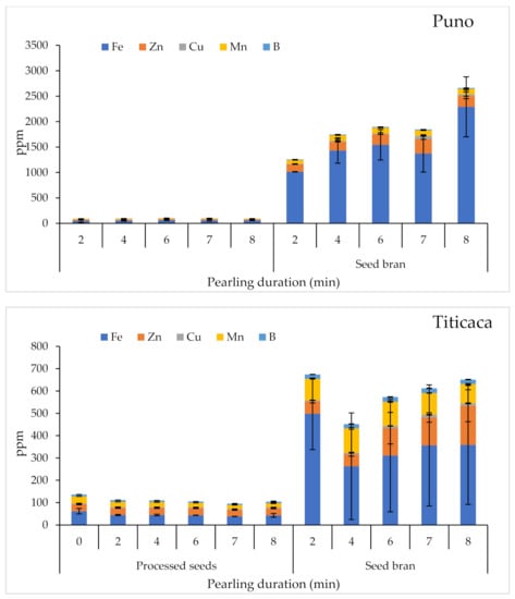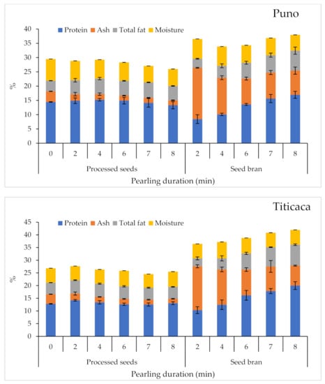 The ash contents for the three studied varieties fit within the range reported in the literature [40]. The ash content of treated seeds decreased with the increase of the pearling duration. After 2 min of mechanical abrasion, the ash content decreased sharply for all studied varieties. The decrease of ash content is explained by the fact that the pericarp, where most of the minerals are mostly concentrated, was removed. On the other hand, the seed bran obtained from two minutes of mechanical abrasion is highly rich in minerals, and the ash contents were equal to 18.0%, 17.3%, and 16.7% (dry weight basis) for Puno, Titicaca, and ICBA-Q5, respectively. In another study, Ando et al. [29] reported that the ash content was about 9.2% (dry weight basis) in the bran after pearling. That is relatively lower than the content found in this work, which can be explained by the use of different pearling processes and equipment.