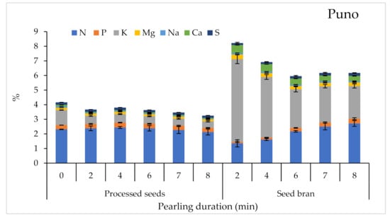 Macro-nutrient variations in response to pearling duration are presented in Figure 5. Pearling had no significant effect on macronutrient contents in the processed seeds, but it had resulted in very highly significant differences (p < 0.001) for most of the macronutrient contents in the bran except Mg and S. The variety effect was obvious and significant for all macronutrients and for both processed seeds and bran. Regarding processed seeds, the highest contents in terms of N, P, and S were recorded for Titicaca; the highest content in terms of K, Mg, and Na for ICBA-Q5; and the highest content in terms of Ca for Puno. Most of the macronutrient contents in seed bran decreased with pearling, except N and P whose contents increased with the pearling.