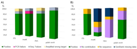 Molecular marker performances (%). Sequencing performances, namely the frequencies on which were obtained high quality sequences (green) and technical affecting factors (A). Contribution to species identification, namely the frequencies on which Blast comparison returned a single reliable best match (green) and affecting factors (B). No statistical analysis was performed due to the number of samples.