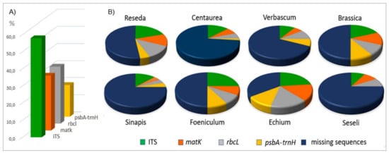 The ITS target was the most useful DNA marker due to the number of sequences deposited in GenBank, with about 58.02% of congeneric species (and subspecies), and its recognized discriminatory power. It is characterized by an easy amplification, but as drawback the ITS of possible fungal endophytes can be amplified as well (recorded here as sequencing failure). Although the intergenic spacer psbA-trnH is demonstrated to be easily amplified and sequenced and useful for species identification (64.29% of samples) [60,61], it is poorly represented in GenBank (18.52% of congeneric species of the Latium flora). Its high sequence length variability, ranging from 152 to 851 bp in eudicotyledons, from 151 to 905 bp in monocotyledons, and from 283 to 1006 bp in gymnosperms [60], was useful in the lab practice to distinguish among different specimens just after an electrophoretic run (e.g., Foeniculum vulgare ca. 350 bp and Verbascum sinuatum ca. 600 bp).