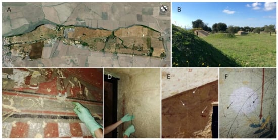 Due to its artistic and historic relevance, the Etruscan necropolis of Monterozzi in Tarquinia (Latium, Central Italy) (Figure 1A) has been included, together with those of Cerveteri, in the UNESCO World Heritage Site list since 2004. The tombs, dating from the 7th to the 3rd century BC, were dug in calcarenites banks (Macco stone) and lie at depths ranging from 2 to 8 m [23]. As with other hypogea, these tombs are characterized by a high humidity level, a stable temperature throughout the year, and limited air circulation [26,67]. The necropolis landscape (Figure 1B) is characterized by the presence of many tumuli (which gave the name to the area of Monterozzi). Most of them have been flattened by agricultural practices and others have been dismantled and partially rebuilt to protect the main chamber without considering the original shape [36,68].