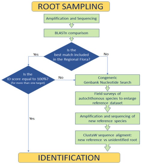 BLASTn best results (Table 2) were cross-referenced with our floristic data of the site and the checklist of the Italian flora [75]. In this way, it was possible to remove some matches at species level corresponding to plants not present in the local flora. To assess the matching reliability, we performed a search in the NCBI nucleotide database for all the congeneric species present in the Latium flora (https://www.ncbi.nlm.nih.gov/nucleotide/, accessed on 6 January 2021). For each congeneric species, we recorded the number of sequences found for each used DNA marker. Because the length of sequences could influence the best score, we reported the minimum and maximum sequence length. Due to the scarcity of genetic information when a plant was represented in the Latium flora as subspecies only, we also included the relative species, and plant data were recorded accordingly (Table S2). To implement the reference database, in summer 2020, after the COVID-19 lockdown and restrictions, we performed a recognition in the field (limited to the visitors’ path) looking for congeneric species. Six plant species were collected and identified according to the analytical keys in [63,76]; their leaves were processed for molecular purposes as previously described for root samples. The obtained sequences were used as additional reference material (Table S4). ClustalW was used to align/compare sequences of reference specimens with unidentified roots. The procedure of the identification workflow is resumed in Figure 4.