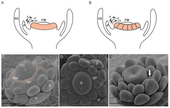 Flowers with ring meristems: (A) closed ring meristem and (B) fragmented ring meristem; the ring meristem is shown in orange. Black arrows indicate the direction of stamen primordia initiation. (C–E) Ring meristem of Eschscholzia californica forming stamen primordia. (C) Bud of a late stage 4 flower in which the floral dome separates from the ring meristem (indicated by a blurred orange line). (D) Stage 5 bud showing the continuous formation of stamen primordia while the gynoecium has already initiated. (E) Stage 6 bud showing the formation of new stamen primordia (white arrow) at the time when the early stamens already form a flat surface for microsporangia initiation. The sepals were removed in all images, and staging was done according to Becker et al. (2005) [44]. Abbreviations: b, bidirectional; cp, centripetal; cf, centrifugal; FD, floral dome; FM, floral meristem; G, gynoecium; P, petal; RM, ring meristem; SE, sepal; SP, stamen primordium; S, stamen. Scale bar in C = 86 µm, in D = 100 µm, in E = 120 µm ((A,B) modified from Endress, 2011; (C–E) from Becker, 2016 with permission) [7,43].