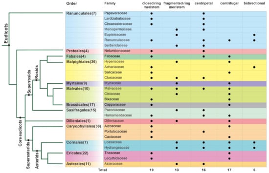 Eudicots comprise 44 orders, and ring meristems producing extra stamen whorls are found in 13 of them (APG, 2016 and Figure 2) [45]. Interestingly, the fraction of families with ring meristems per order is unequally distributed across the phylogeny. In Ranunculales, all families have members with ring meristems, and almost all combinations of closed/fragmented architecture and directions of stamen primordia initiation occur. Asterales consist of 11 families and a staggering number of almost 27,000 species, but include only the genus Taraxacum within the Asteraceae that has a ring meristem. In most orders, only a fraction of members develop ring meristems. For example, in Proteales, Fabales, Brassicales, and Myrtales, only a single family includes members with ring meristems. Interestingly, most ring meristems are of the closed type, and the number of orders with centripetal and centrifugal initiation of primordia is similar. However, bidirectional initiation is rarely found (Figure 2). Interestingly, centripetal primordia initiation is predominant in the non-core eudicot orders of Ranunculales and Proteales; however, in the core eudicots, centrifugal initiation is found more often. In several groups, a closed ring meristem is associated with centripetal primordia initiation, for example, in the Ranunculales, Protetales, Fabales, Hamamelidaceae, and Portulacaceae. In contrast, all combinations of primordia initiation direction and closed/fragmented ring meristem occur within the Malvales. According to our data, there seems to be no preference in the co-occurrence between closed and fragmented ring meristems and the direction of stamen primordia initiation. However, data compilation on the species level are lacking so far.