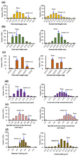 Frequency distribution plots for: (a) the first and second leaf length, (b) leaf width, (c) leaf weight, (d) leaf area, (e) specific leaf area, (f) biomass yield and grain yield in RILs of H94061120 × Xena population. Parental means are indicated for each trait.