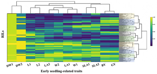 As the traits were measured in different scales, all data were normalized by subtracting the mean and dividing by the maximal rank, in such a case, bringing each value to its empirical percentile. To confirm that, the genetic grouping of 185 RILs for the twelve early seedling traits (ESV) is presented in a heat map (Figure 2).