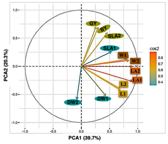 Our results confirmed previous findings stating specific leaf area as a suitable trait for the selection of plants with good ESV in cereals [38]. Hence, specific leaf area, the ratio of leaf area to leaf dry mass, is a key functional trait of plants underlying variation in growth rate among species [39,40]. Specific leaf area is also a major trait in the worldwide leaf economics spectrum, which reflects the range of fast to slow returns on nutrient and dry mass investment in leaves among species [40]. We also found that the width of the first leaf is highly correlated with leaf area. It was suggested that the leaf width of the first leaf should integrate embryo size and specific leaf area, and this would be a simple way to screen and select for high early vigour. Seedling leaf width was highly heritable and had a high genetic correlation with total leaf area in wheat during the vegetative stage [41]. Sundgren et al. [42] also showed the importance of both embryo size and SLA in determining vigour among wheat lines. The studied traits L1, L2, LA1, LA2, DW2, BY and GY had high heritability (>30%). These results indicate the possibility of additive gene effect for the expression of these traits. Therefore, selection would be effective for improving these traits.