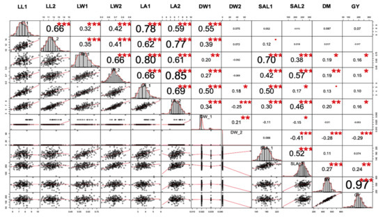 The correlation between most of the trait combinations was found to be significant (Figure 4). The strongest positive correlation among traits was found between GY and BY, LA2 and LW2 and LA1 and W1 across all three environments. There was a close relationship between the two traits of the first and second leaves. There was a positive correlation between LA2 and W1. An identical pattern was found between the pairs (LA2–LA1) and W of the second leaf (W2–W1). SLA was positively correlated with LA and negatively correlated with DW, regardless of the rank of the leaves. However, an examination of the relationship between SLA and DW of the second leaf revealed a significant negative correlation, while SLA1 was weakly correlated with DW1. The relationship between SLA1 and LA1 was similar to the one between SLA2 and LA2. An identical correlation pattern was found between leaf area and leaf length of the first and second leaves. A weak correlation was observed between DW2 and L2, while the correlation between DW1 and L1 was significant. SLA2, LA2, L2, and W2 were positively correlated with GY and BY (Figure 4), while a weak correlation was found between the characteristics of the first leaf (SLA1, LA1, L1, W1) and GY, suggesting that the early seedling traits associated with the second leaf could be used to predict grain yield and biomass yield. A significant correlation was observed between GY and BY.