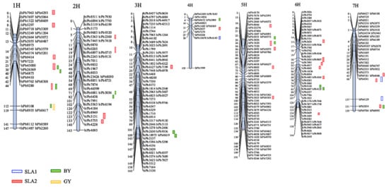 Out of 35 significant QTLs, 26 were found for SLA2 with a LOD ranging from 3.06 on Chr. 5H to 7.18 on Chr. 1H and 6H, seven were for BY ranging from 3.01 to 4.18, and two were for GY with a LOD of 3.67 and 3.03. From 26 detected QTLs controlling SLA2, twenty-one, three, one and one were found explaining 18%, 19%, 17% and 16% of the phenotypic variation (PVE), respectively (Table 3). Six of the QTLs identified for BY accounted for 9% of the phenotypic variance, while the remining QTLs captured 18.1% of the variance, respectively. The phenotypic variances explained by the two QTLs for GY were 17.8% and 6.9% (Table 3). As shown in Figure 5, five, four and one QTLs were identified for SLA2, BY and GY, respectively, on chromosome 1H. Moreover, five clusters of QTLs for the traits included three QTLs for SLA2, and one for each of BY and GY traits were located in a similar position on chromosome 1H within the interval (44.0 to 108.0 cM) and shared a common nearest marker, bpb9280. Major QTLs for BY and GY traits were located on chromosome 1H within the intervals 107.8–127.6 cM and 110.2–120.4 cM, and in addition, common QTLs for SLA2, BY, and GY with common markers bpb9108 and bPb9280, respectively. QTLs for SLA2 and BY were found on chromosome 1H within the intervals 43–76.5 cM and 48.1–106.7 cM, respectively, and shared a common marker bPb9280, and QTLs for SLA2 and BY were detected on chromosome 5H within the intervals 33.3–54.2 cM and 34.6–56.7 cM and shared a common marker, bpb1820. Furthermore, one significant cluster was detected on chromosome 7H: QTLs for SLA2 and BY located within the intervals 153–158.7 cM and 134.6–156.8 cM with bPb2854 as the closest marker (Figure 5).