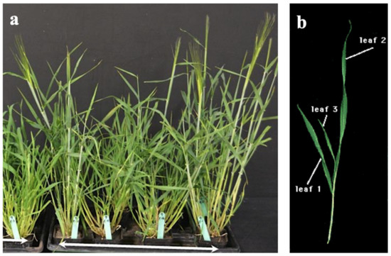 Phenotypic evaluation of barley 185 F5 RILs and two parental lines. (a) All genotypes were evaluated in 6-inch pots at the greenhouse with four replicates. (b) Measurement of leaf length and width of the first two mainstem leaves.