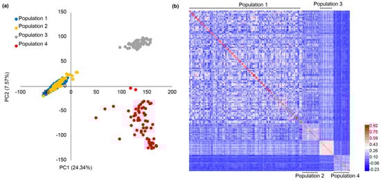 In total, 18,702 high-quality SNPs were obtained after SNP filtering and imputation. These SNPs were distributed evenly across the ten chromosomes (Figure S2), and the marker density was sufficiently high for implementing GP []. Considering there were pedigree relationships among some populations, the genotypic data were used to show the genetic relationships among the four populations. PC (principal component) analysis showed that PC1 and PC2 explained 24.34% and 7.57% of total variances (Figure 1a). The two PCs could divide the four populations into three groups, with population 1 and 2 in one group, and population 3 and 4 in another two groups (Figure 1a). The genetic similarity matrix was used to plot the heatmap, which showed that relationships among population 1, population 2, and population 3 were close. The relationship between population 4 and other populations was distant (Figure 1b). The genetic similarity matrix generally complied with their relationships in that population 1 and 2 had two common parents, and population 3 had one common parent with population 1 and 2.