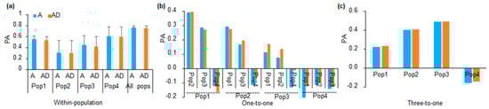 GP across different populations. (a) PA of the within-population GP, which was performed with five-fold CV and was repeated 100 times. A and AD were the GBLUP models including only additive effect, and additive plus dominance effects, respectively; Pop1-Pop4 were population 1–4, and all pops indicated all populations were used together to perform within-population GP (b) PA of the one-to-one prediction scheme. The lower name in the x-axis is the training population, and the upper name in the x-axis is the validation population; (c) PA of the three-to-one prediction scheme. The populations in the x-axis are the validation population, and the remaining three populations were used together as the training population.