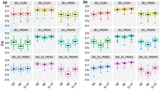We also found that the PAs were always the highest when lines in BJ were used as the validation population, and lowest when lines in HN were used as the validation population for all models (Figure 3a,b, Table S4), which should be related to the fact that yield in XJ had the highest heritability, and that in HN it had the lowest heritability (Table S2). In addition, for both AE and G × E models, the PAs of the CV2 scheme were always higher than those of the CV1 scheme. In the CV2 scheme, each line was evaluated in at least one environment, suggesting that GP worked better for lines with phenotypic data in some environments.
