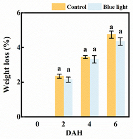 Stomatal transpiration in detached leaves and plants is strongly related to weight loss, which could be regulated by light during either pre-harvest or post-harvest (especially blue light) [28]. During storage at 1 °C, the fresh weight loss of Chinese kale was higher in light treatment using fluorescent tubes than in dark, which was positively correlated with stomata opening [5]. The weight loss of broccoli during the storage period increased by the continuous white-blue light radiation due to a higher transpiration rate [4]. The weight loss of broccoli heads showed an increase in conjunction with continuous low intensity white light treatment during post-harvest storage [29]. On the contrary, the weight loss of broccoli was strongly inhibited by the pre-harvest UV–B radiation compared with the control [24]. In this study, the flower stalk of Chinese kale lost 4.7% and 4.3% in control and supplemental blue light treatment at 6 DAH, respectively, which meant a lower weight loss in the flower stalk radiated by pre-harvest supplemental blue light (Figure 2). However, no remarkable difference between treatments was found in this study, which might be due to the fact that there were less of an effect on stomata opening under pre-harvest supplemental blue light than post-harvest light treatment.