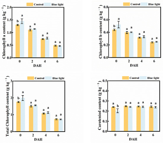 Regardless of pre-harvest treatment, the contents of chlorophyll a, chlorophyll b, and total chlorophyll observably decreased during storage (Figure 3). At 6 DAH, the total chlorophyll content was about 50% less than at harvest. At 0 DAH, the flower stalk exposed to blue light indicated higher contents of chlorophyll a, chlorophyll b, and total chlorophyll than the control, with increases of 11.5%, 18.2% and 13.1%, respectively. No significant differences in these pigment contents were observed between the two treatments during storage. The carotenoid content in the flower stalk showed few changes during storage. Although a lower carotenoid content in flower stalk supplemented with blue light than control at harvest was found, there were no differences in carotenoid content between treatments during storage.
