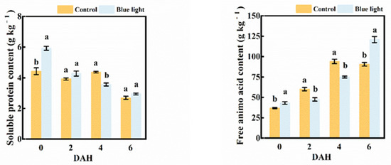 The taste of vegetables is partially influenced by their free amino acids, which come from proteolysis [37]. Amino acid metabolism plays an important role in stress responses and some secondary metabolites are further derived from various amino acids [38]. The cultivation with blue LEDs showed a higher concentration of free amino acids in Spirulina sp. cultures [39]. In this study, pre-harvest supplemental blue light markedly induced the flower stalk of Chinese kale to enhance free amino acids content and decrease soluble protein content during storage (Figure 4). The content of free amino acids in the flower stalk of Chinese kale in control was higher at early storage period, while those in supplemental blue light treatment ended up with higher free amino acid content at 6 DAH, which might be highly correlative to different proteolysis and other secondary metabolisms during storage.