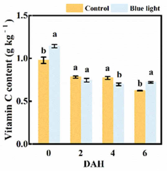 Vitamin C, also known as ascorbic acid, is a necessary micronutrient for the human body (especially for the functioning of bodily systems). The de novo biosynthesis, degradation, and recycling of vitamin C collectively keep balance in plants. In three citrus varieties, blue LED light treatment highly increased the vitamin C content as well as transcription expression of genes related to vitamin C biosynthesis [40]. A significant reduction of vitamin C content in the flower stalk of Chinese kale was found in two treatments at 2 DAH (Figure 5). The vitamin C content in harvested broccoli reduced in darkness during storage because of lower stability of vitamin C, owing to a high ROS content [41]. In red and green leaf pak choi, vitamin C content showed a marked increase by supplemental blue light [32]. Pre-harvest supplemental blue light treatment increased vitamin C content in the flower stalk of Chinese kale at 0 and 6 DAH compared with the control (Figure 5). Thus, pre-harvest supplemental blue light might increase the expression of biosynthesis, enhance the regeneration of genes related to vitamin C, and effectively keep the vitamin C content in the flower stalk of Chinese kale during storage.