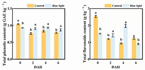 Pre-harvest blue light enhanced the total phenolic and flavonoids contents in the flower stalk of Chinese kale during storage (Figure 6). The total phenolic content in the control flower stalk decreased 26.9% at 2 DAH, and remained steady during storage. Those treated with supplemental blue light revealed no marked decrease during storage. Even though the total phenolic content in the flower stalk treated with supplemental blue light was lower (10.6%) at harvest, this was 19.7%, 13.3%, and 10.1% higher than control at 2, 4, and 6 DAH, respectively. Hence, pre-harvest supplemental blue light contributed to the maintenance of the total phenolic content.