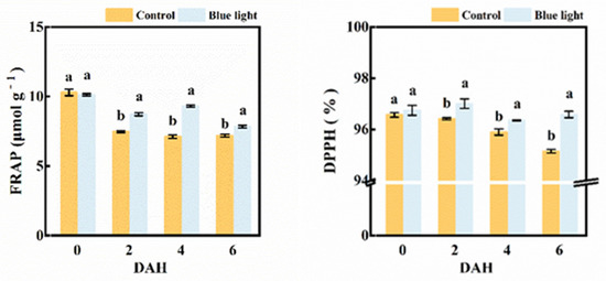 The FRAP value and DPPH activity in the flower stalk of Chinese kale during storage in darkness at 15 °C. Values with different lowercase letters on the top of the columns indicate significant differences (p < 0.05), according to Duncan’s test. Vertical bars represent the standard margin of error. 0 = 0 DAH, 2 = 2 DAH, 4 = 4 DAH, and 6 = 6 DAH.